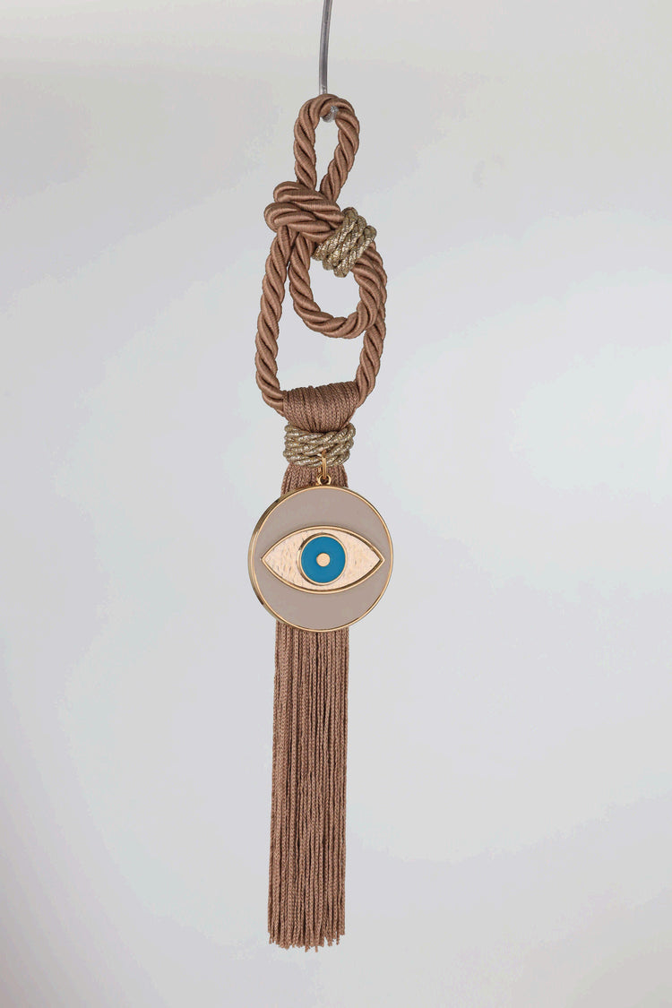 Γούρι σπιτιού 2023 με κορδόνι σε καφέ χρώμα και μάτι από σμάλτο.
