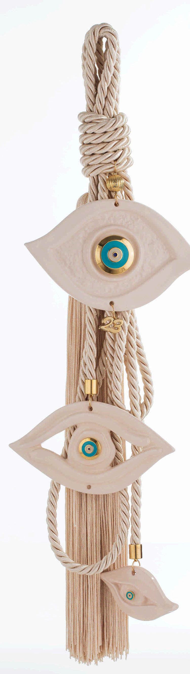 Γούρι σπιτιού 2023 με κορδόνι σε μπεζ χρώμα και κεραμικά μάτια.
