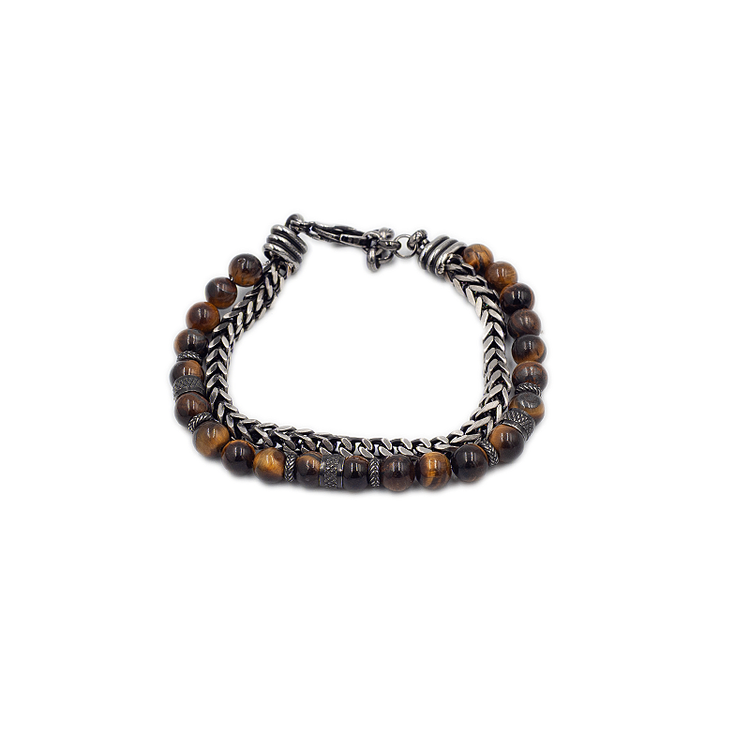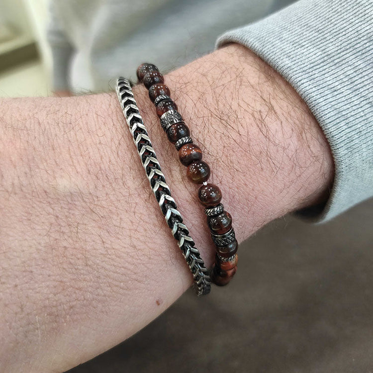 Μία ποιοτική δημιουργία που διαθέτει ατσάλινο δέσιμο και καφέ χάντρες, ιδανικό για κάθε ανδρική εμφάνιση.