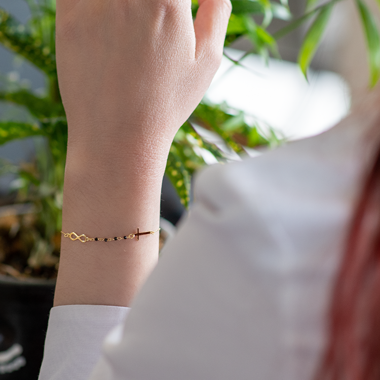 AV χρυσό γυναικείο βραχιόλι με σχέδια το άπειρο, σταυρό και μαύρες πέτρες