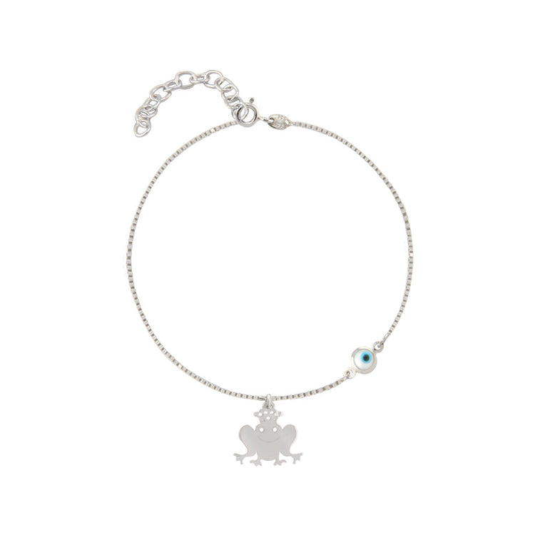 Ένα παιχνιδιάρικο γυναικείο βραχιόλι, κατασκευασμένο από ασήμι 925. Διαθέτει λεπτή αλυσίδα διακοσμημένη με ένα κρυστάλλινο ματάκι και ένα βάτραχο.