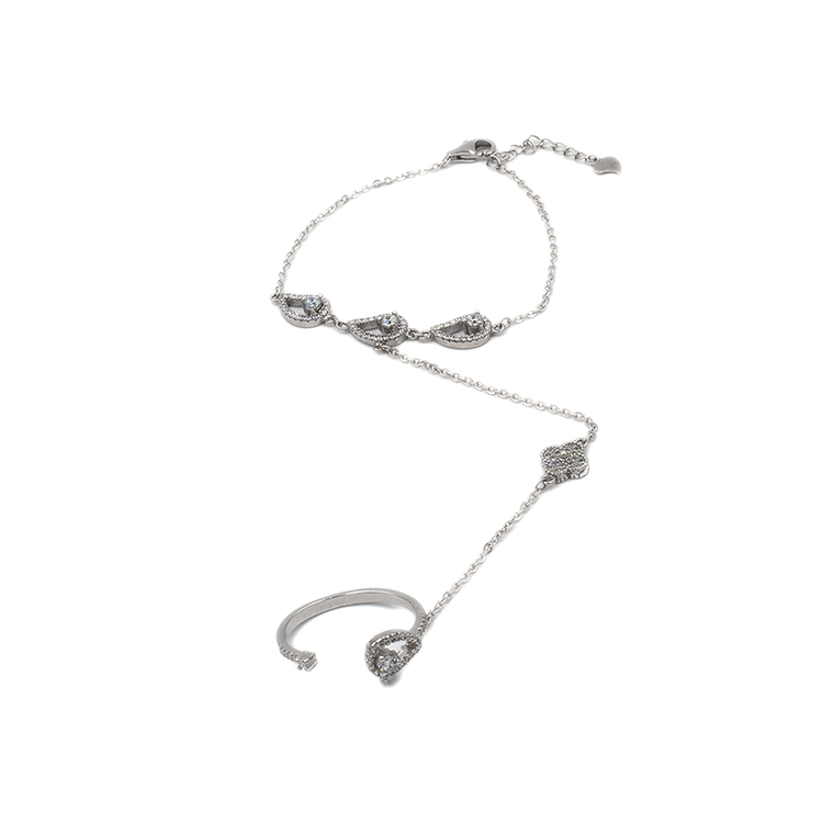 Το φινίρισμα του δαχτυλιδιού, βραχιόλιου είναι λουστρέ.  Το δαχτυλίδι είναι ανοικτό και στο πάνω μέρος έχει σχήμα δάκρυ διακοσμημένο με πέτρες ζιργκόν και μικρότερες να το πλαισιώνουν. Η αλύσιδα που ενώνει το δαχτυλίδι με το βραχιόλι διαθέτει ένα λουλούδι διακοσμημένο με πέτρες ζιργκόν. Το βραχιόλι αποτελείτε από τρια στοιχεία σε σχήμα δάκρυ διακοσμημένα με μία πέτρα ζιργκόν το καθένα και μικρότερες να το διακοσμούν.