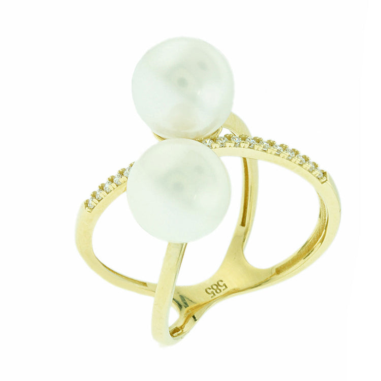 Χρυσό δαχτυλίδι σε χιαστί σχήμα, με δύο μαργαριτάρια στο κέντρο του, λουστρέ φινίρισμα και διακοσμημένο με πέτρες ζιργκόν λευκού χρώματος.