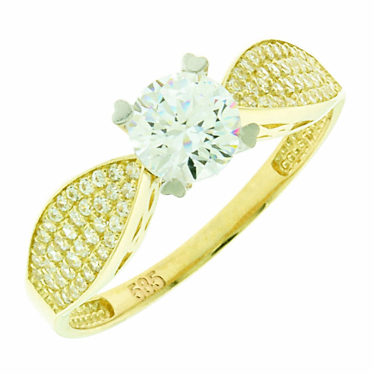Ένα εντυπωσιακό μονόπετρο δαχτυλίδι, κατασκευασμένο από χρυσό μέταλλο 14Κ, σε χρυσή, λευκόχρυση απόχρωση και λουστρέ φινίρισμα.