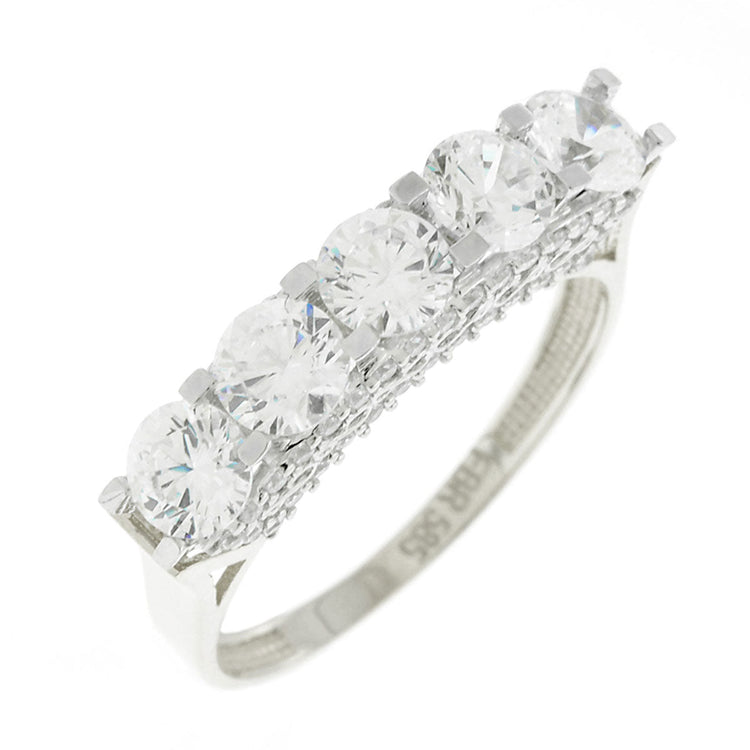 Αποτελείται από πέντε πέτρες ζιργκόν λευκού χρώματος κατά μήκος του δαχτυλιδιού, οι οποίες κρατούνται από τέσσερις λευκόχρυσους ράβδους η καθεμία και διακοσμείται με μικρότερες πέτρες ζιργκόν στα πλαϊνά, δημιουργώντας ένα όμορφο αποτέλεσμα.