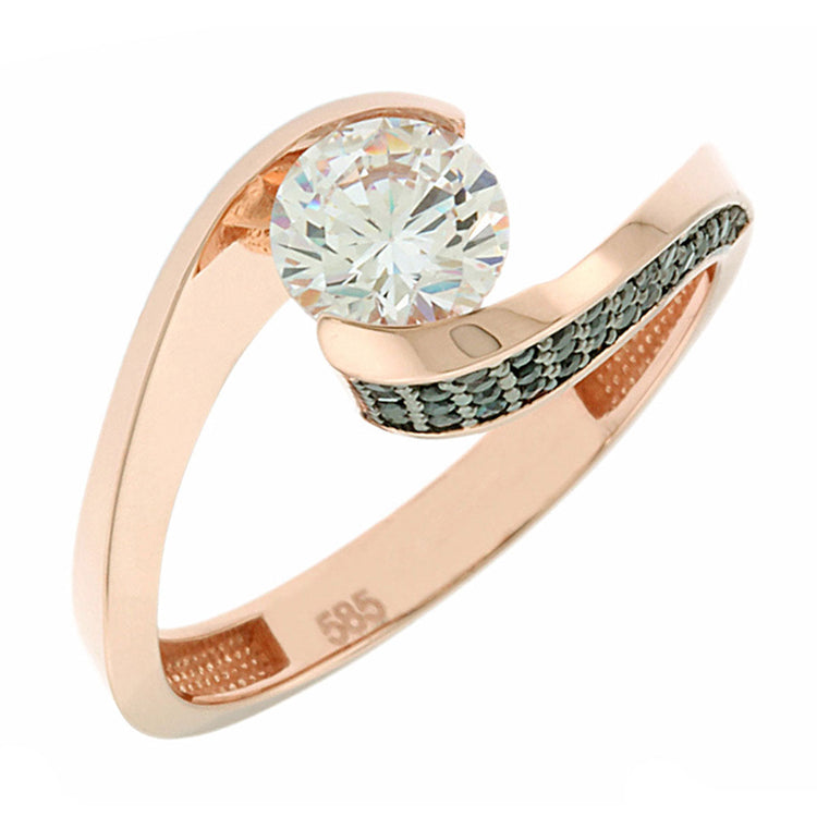Ένα εντυπωσιακό μονόπετρο δαχτυλίδι, κατασκευασμένο από χρυσό μέταλλο 14Κ, σε ροζ χρυσή απόχρωση και λουστρέ φινίρισμα.