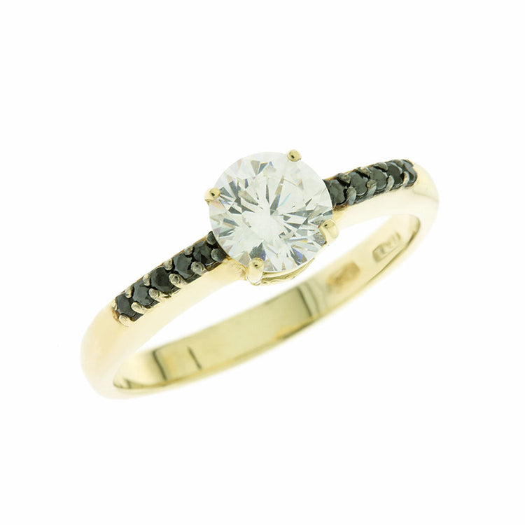 Χρυσό μονόπετρο δαχτυλίδι, διακοσμημένο με πέτρα ζιργκόν λευκού χρώματος στο κέντρο, μαύρες πέτρες ζιργκόν περιμετρικά του και λουστρέ φινίρισμα.