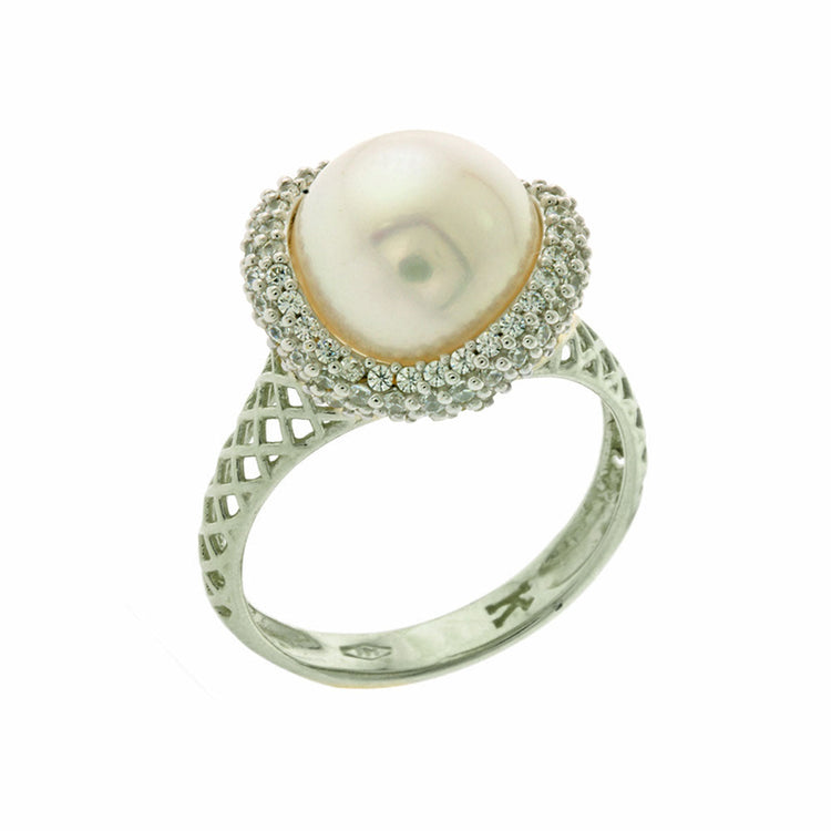 Ένα εξαιρετικά κομψό και διαχρονικό λευκόχρυσο δαχτυλίδι με μαργαριτάρι στο κέντρο του, πέτρες ζιργκόν λευκού χρώματος και διάτρητο στεφάνι.