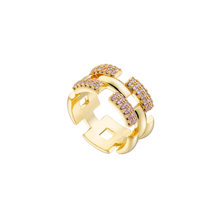 Ένα λαμπερό γυναικείο δαχτυλίδι, κατασκευασμένο από μέταλλο σε κίτρινο χρωματισμό και ροζ ζιργκόν σε όλη την επιφάνεια.