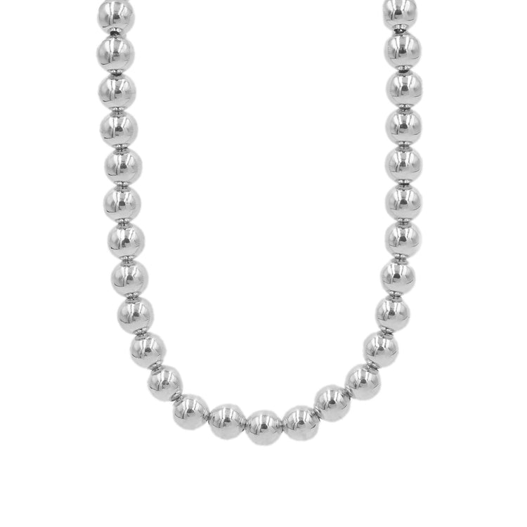 Η επιφάνεια του κολιέ είναι λουστρέ και αποτελείται από κατά σειρά μπίλιες σε ασημί χρώμα. Ένα εντυπωσικό κολιέ που θα σας συνοδεύει σε κάθε σας έξοδο.