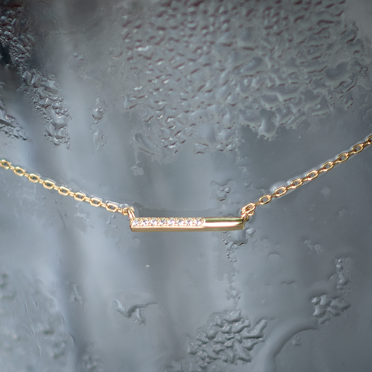 Διαθέτει λουστρέ επιφάνεια και λεπτή αλυσίδα. Αποτελείται από μια μπάρα διακοσμημένη με λευκά ζιργκόν.