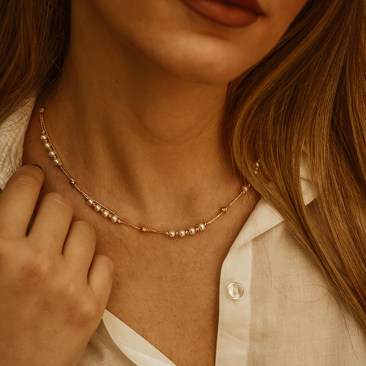 Η επιφάνειά του είναι λουστρέ και διαθέτει αλυσίδα με φανταστική πλέξηΔιπλό κολίε με μαργαριτάρια και διαμανταρισμένες μπίλιες.
