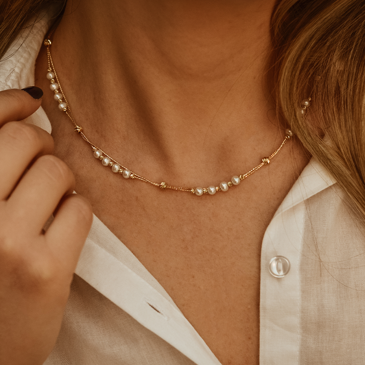 AV χρυσό γυναικείο διπλό κολιέ με διαμανταρισμένες μπίλιες και μαργαριτάρια
