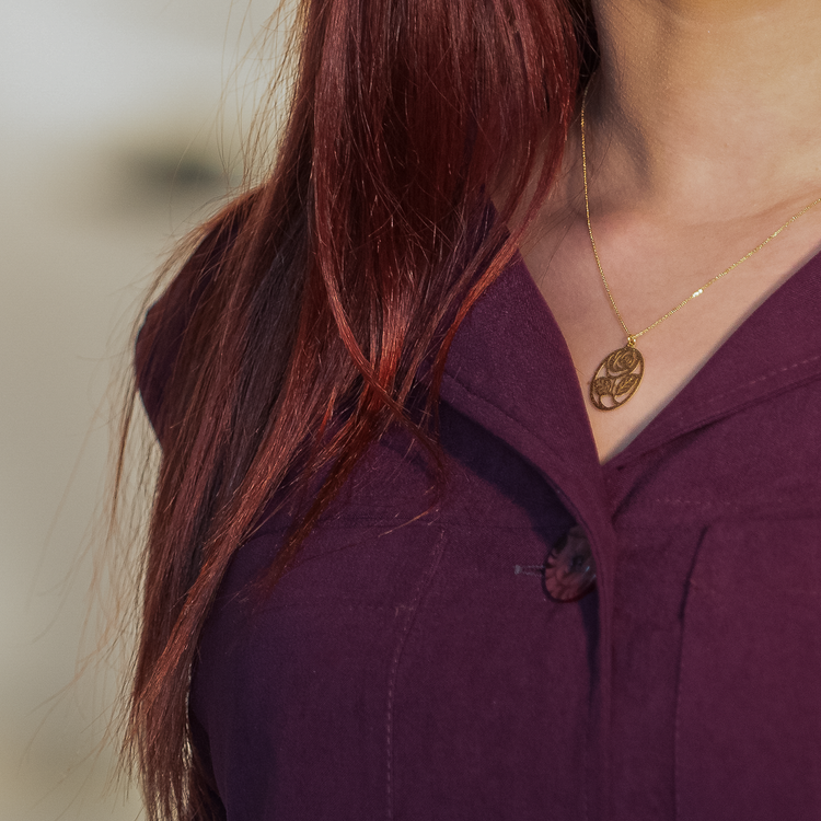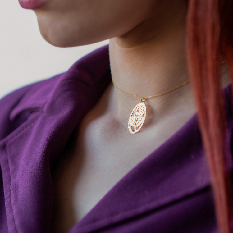 Αποτελέιται από διάτρητο σχέδιο που σχηματίζει ένα τριαντάφυλλο, με διαμανταρισμένη επιφάνεια και διαθέτει λεπτό αλυσιδάκι.