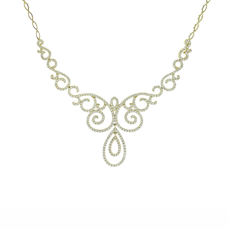 Το κολιέ είναι διακοσμημένο από μεγάλο και περίτεχνο σχέδιο με λαμπερές πέτρες ζιργκόν λευκού χρώματος.