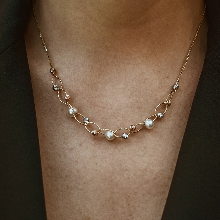 AV χρυσό γυναικείο τρίχρωμο κολιέ με κρίκους, μαργαριτάρια και διαμανταρισμένες μπίλιες