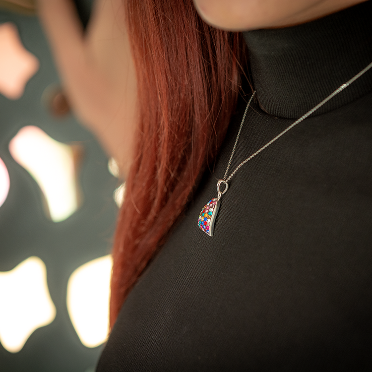 Διαθέτει λουστρέ επιφάνεια και λεπτή αλυσίδα. Κεντρικό του στοιχείο είναι μια καρδιά διακοσμημένη με πολύχρωμα Swarovski.