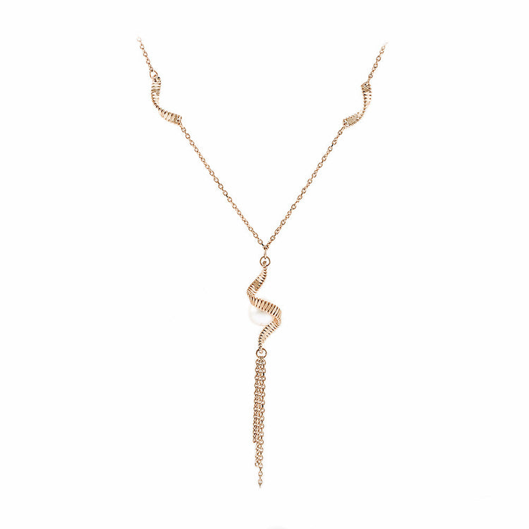 Το κολιέ είναι κρεμαστό , σε στυλ γραβάτα, ενώ παράλληλα διακοσμείται από φυσικό μαργαριτάρι λευκού χρώματος και στριφογυριστά σαγρέ στοιχεία.
