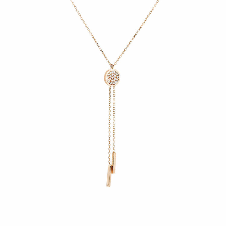 Διαθέτει λεπτή λουστρέ αλυσίδα και δυο κρεμαστά στοιχεία με μπάρα από ροζ-χρυσό.