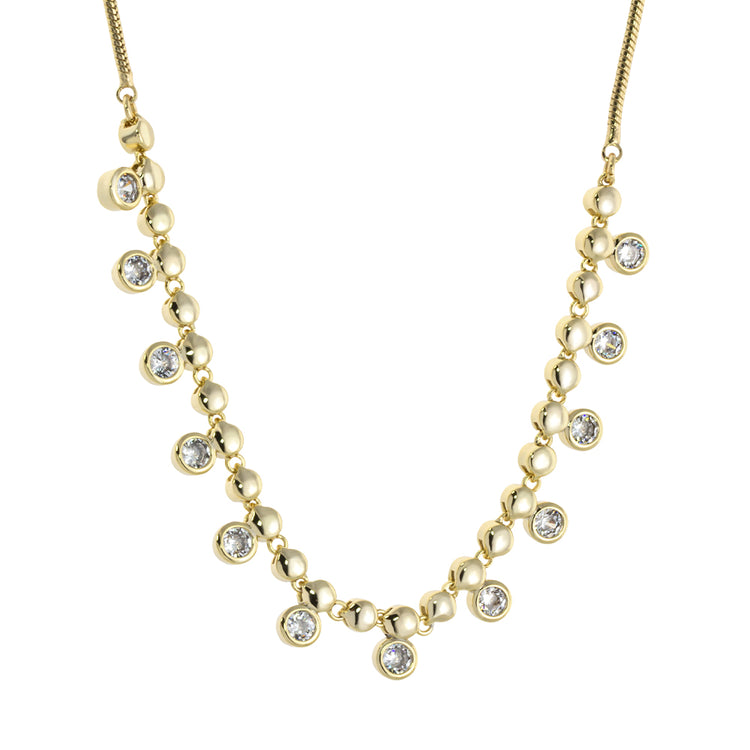 Ένα μοντέρνο γυναικείο κολιέ, κατασκευασμένο από μέταλλο σε κίτρινο χρωματισμό με στοιχεία και ζιργκόν.