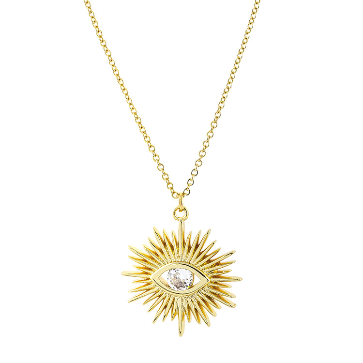 Ένα γοητευτικό γυναικείο κολιέ, κατασκευασμένο από μέταλλο σε κίτρινο χρωματισμό με μάτι που μοιάζει με ήλιο.