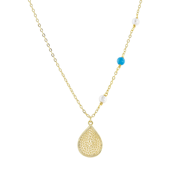 Ένα γοητευτικό γυναικείο κολιέ, κατασκευασμένο από μέταλλο σε κίτρινο χρωματισμό με σταγόνα, τιρκουάζ πέτρα & λευκές πέρλες.