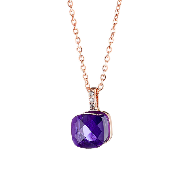 Ένα εκπληκτικό γυναικείο κολιέ, κατασκευασμένο από μέταλλο σε ροζ χρυσό χρωματισμό με μωβ κρύσταλλο & λευκά cz.
