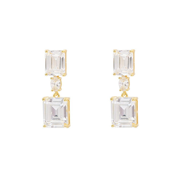 Τα σκουλαρίκια αποτελούνται από λαμπερές πέτρες ζιργκόν λευκού χρώματος σε ορθογώνιο σχήμα. Διαθέτουν τρεις πέτρες οι οποίες ενώνονται μεταξύ τους και δίνουν ένα εντυπωσιακό σχέδιο. Διαθέτουν λουστρέ επιφάνεια.