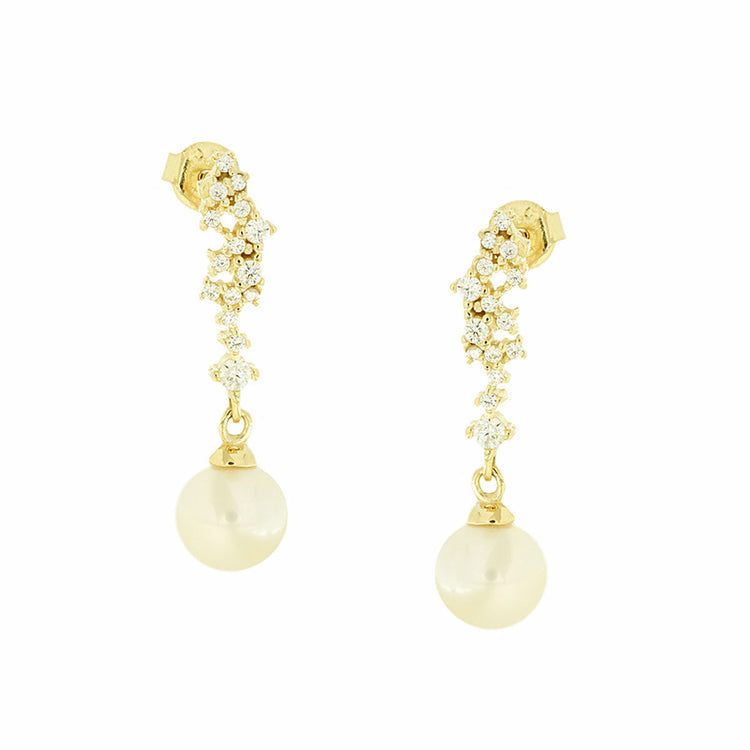 AV χρυσά κρεμαστά σκουλαρίκια με πέτρες ζιργκόν και φυσικό μαργαριτάρι