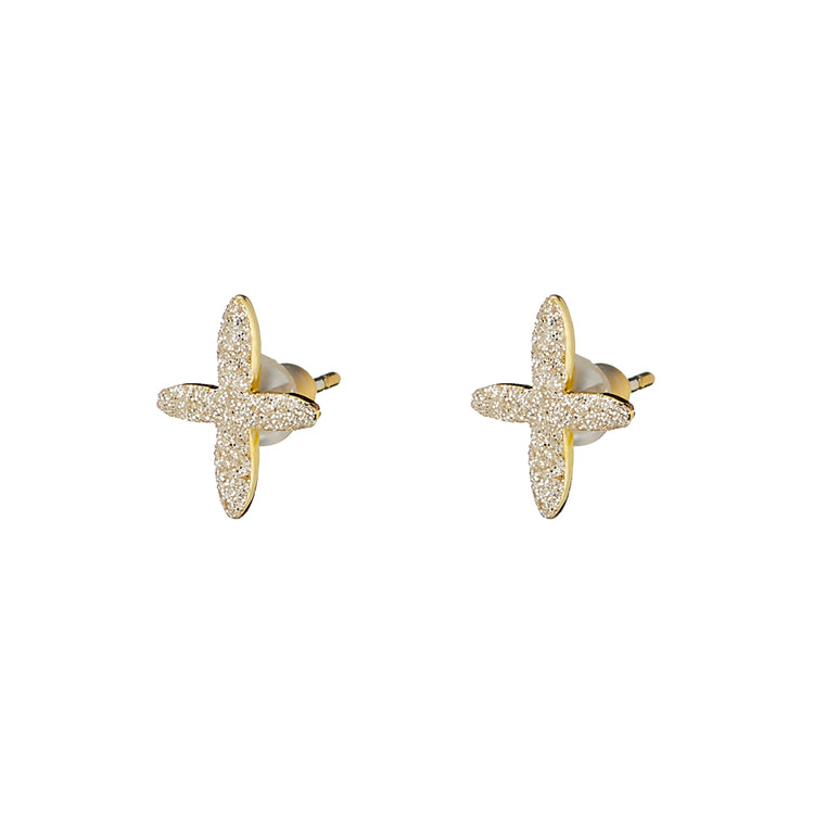Ένα όμορφο γυναικείο σετ σκουλαρίκια, κατασκευασμένο από μέταλλο σε κίτρινο χρωματισμό με σταυρό και ασημί glitter.