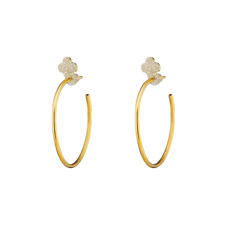 Ένα θαυμάσιο γυναικείο σετ σκουλαρίκια κρίκοι, κατασκευασμένο από μέταλλο σε κίτρινο χρωματισμό με μικρό σταυρό και ασημί glitter.