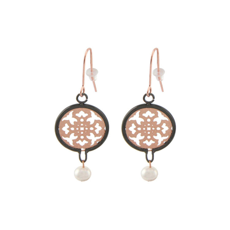 Η επιφάνειά του είναι λουστρέ και αποτελείται από ένα διάτρητο στρογγυλό στοιχείο σε ροζ επιμετάλλωση και μαύρη περιμετρικά του. Από το στοιχείο αυτό κρέμμεται λευκή πέρλα.