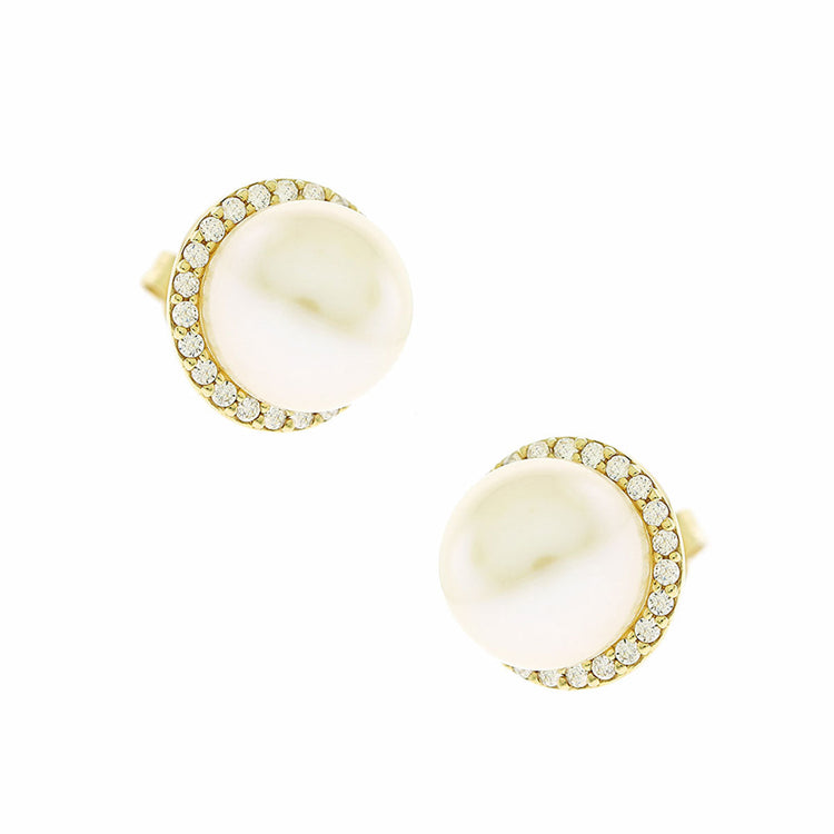 Ένα σετ πανέμορφα χρυσά μαργαριταρένια σκουλαρίκια, διακοσμημένα με πέτρες ζιργκόν περιμετρικά του και λουστρέ φινίρισμα.
