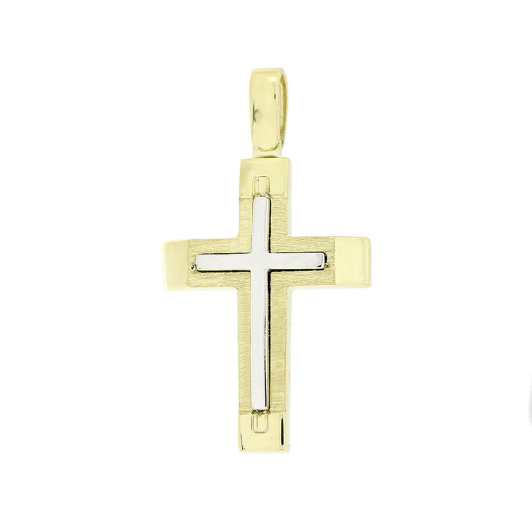 Ένας κομψός και πολύ όμορφος αντρικός βαπτιστικός σταυρός, δίχρωμος, κατασκευασμένος από χρυσό μέταλλο 14 Καρατίων και σαγρέ φινίρισμα στην επιφανειά του.