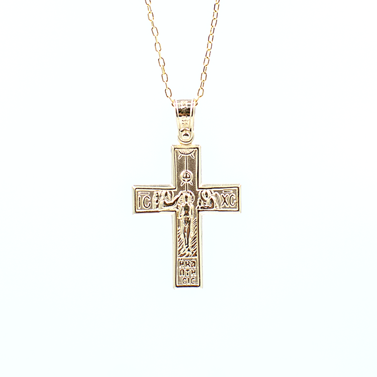 Ένας κομψός και ταυτόχρονα καλοσχεδιασμένος σταυρός με λεπτή αλυσίδα, κατασκευασμένος από χρυσό μέταλλο 14 Καρατίων.