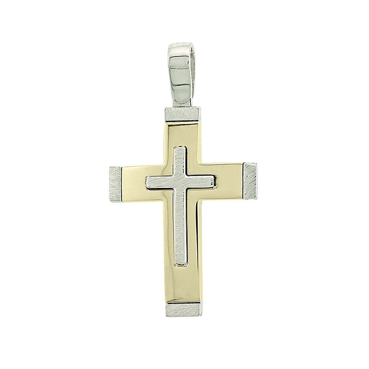 Ένας πολύ όμορφος και αρκετά κομψός ανδρικός βαπτιστικός σταυρός, δίχρωμος , κατασκευασμένος από χρυσό μέταλλο 14 Καρατίων.
