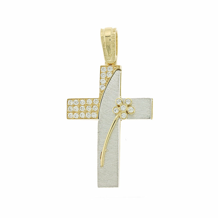 AV δίχρωμος γυναικείος βαπτιστικός σταυρός με ένθετο λουλούδι και πέτρες ζιργκόν