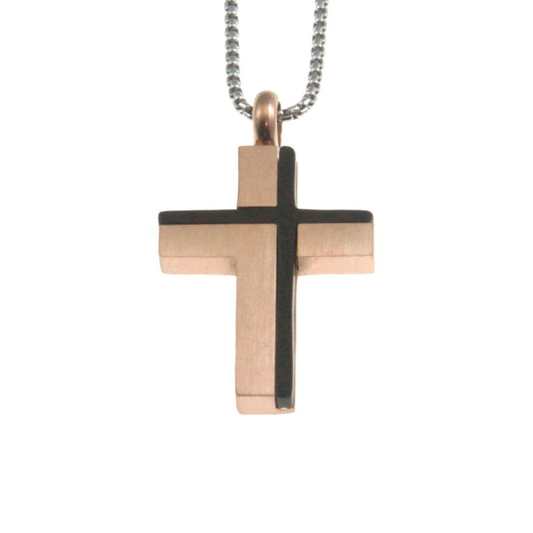 Ένας πολύ όμορφος και με ιδιαίτερο σχεδιασμό σταυρός με αλυσίδα, κατασκευασμένος από δίχρωμο επιροδιωμένο και επίχρυσο ροζ ατσάλι.