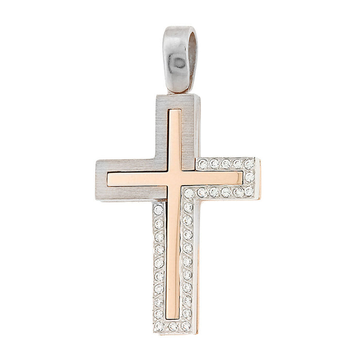 Ένας άκρως εντυπωσιακός γυναικείος βαπτιστικός σταυρός, δίχρωμος, κατασκευασμένος από ροζ-χρυσό και λευκόχρυσο μέταλλο 14 Καρατίων με λουστρέ  και ματ επιφάνεια.