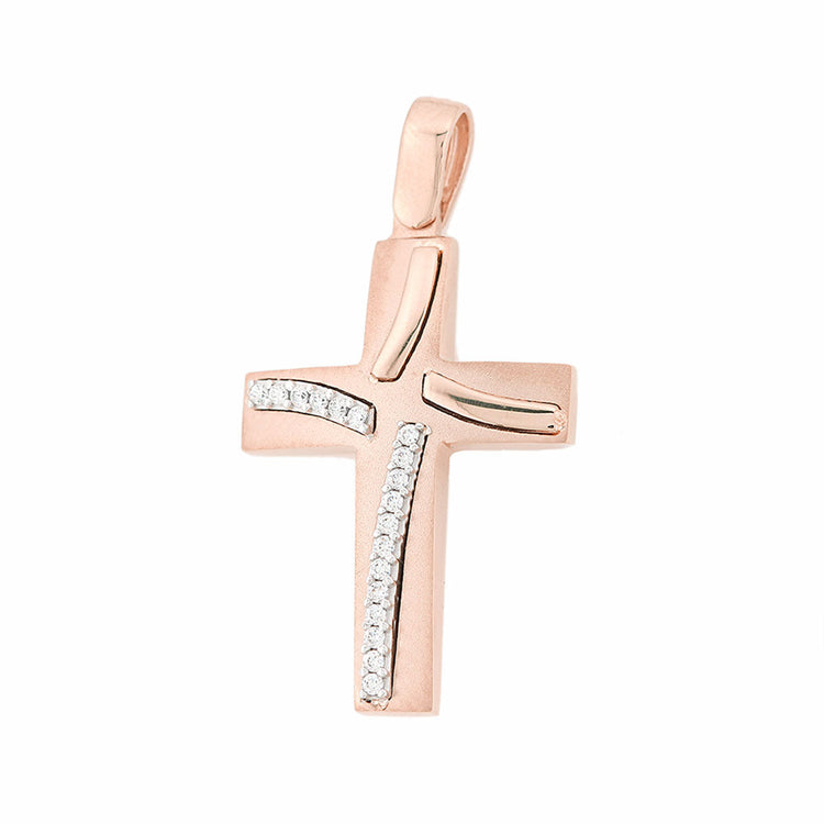 AV ροζ-χρυσός γυναικείος βαπτιστικός ματ σταυρός με λαμπερές πέτρες ζιργκόν