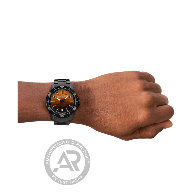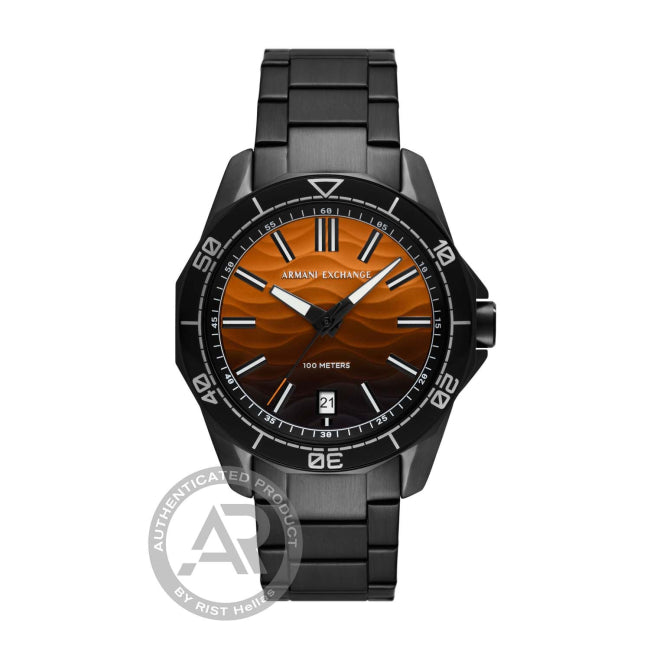 Ένα εντυπωσιακό ανδρικό ρολόι Armani με πορτοκαλί καντράν, μαύρους δείκτες και λευκές λεπτομέρειες στους αριθμούς και σε άλλα στοιχεία εντός του καντράν. Ένα κλασικό ρολόι που θα δώσει μια άλλη νότα στο ντύσιμό σας.