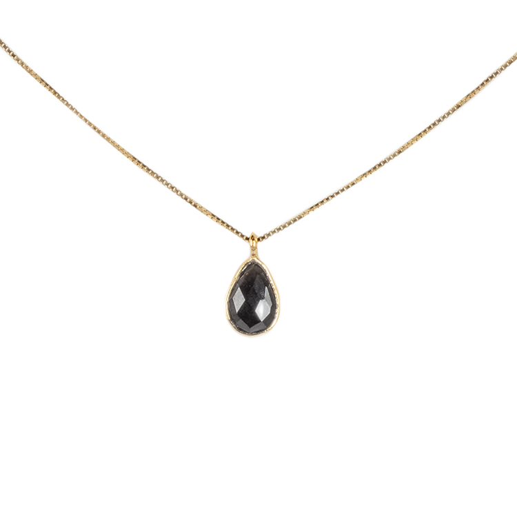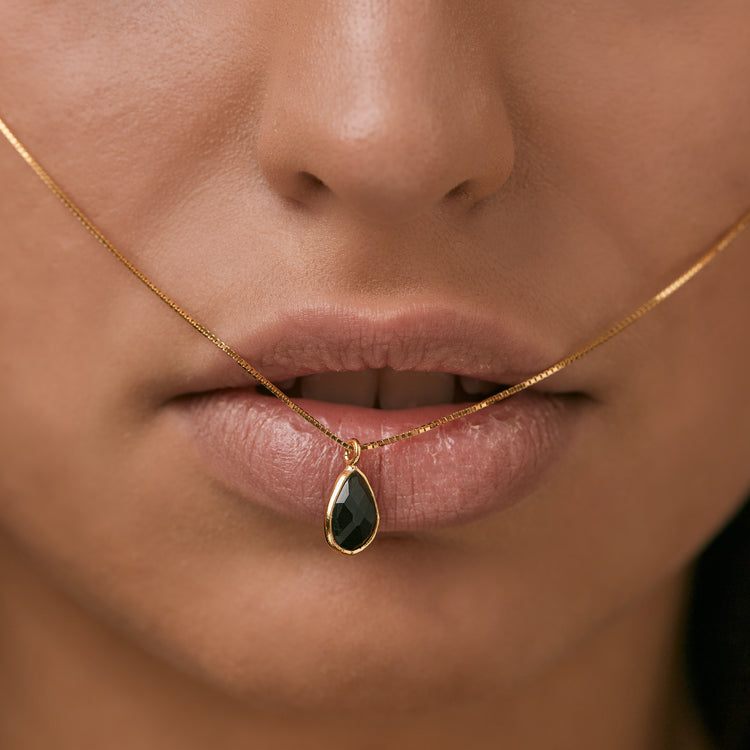 Η επιφάνεια του κολιέ είναι λουστρέ και έχει ως κεντρικό στοιχείο ορυκτή πέτρα όνυχα σε σχήμα σταγόνας. Διαθέτει, επίσης λεπτό αλυσιδάκι.