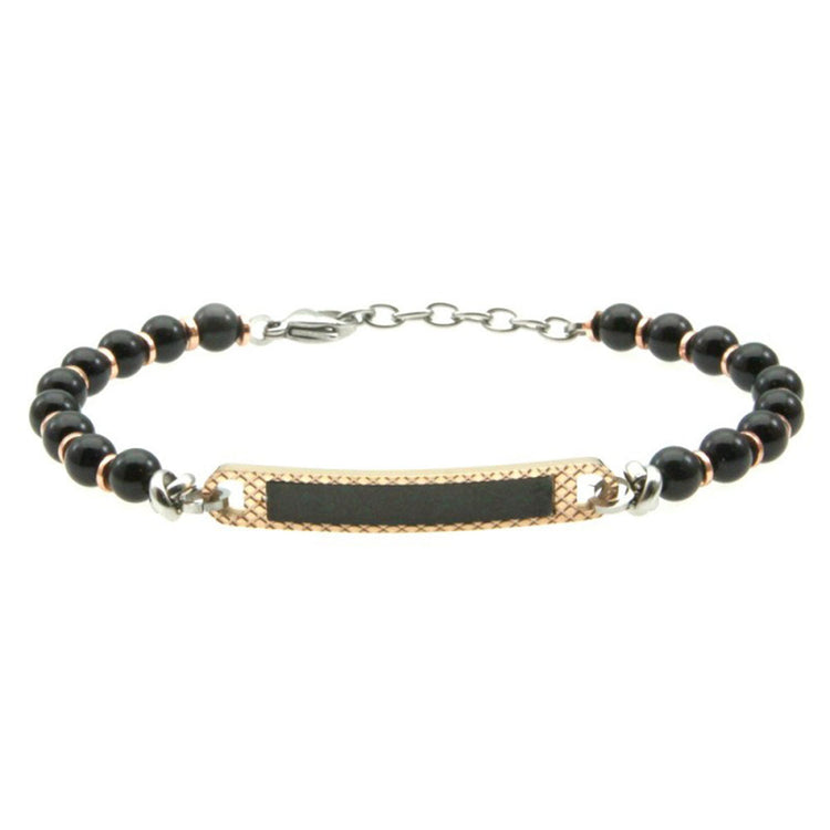AV ανδρικό ατσάλινο βραχιόλι με μαύρες χάντρες και ροζ χρυσή ταυτότητα με μαύρο πλαίσιο