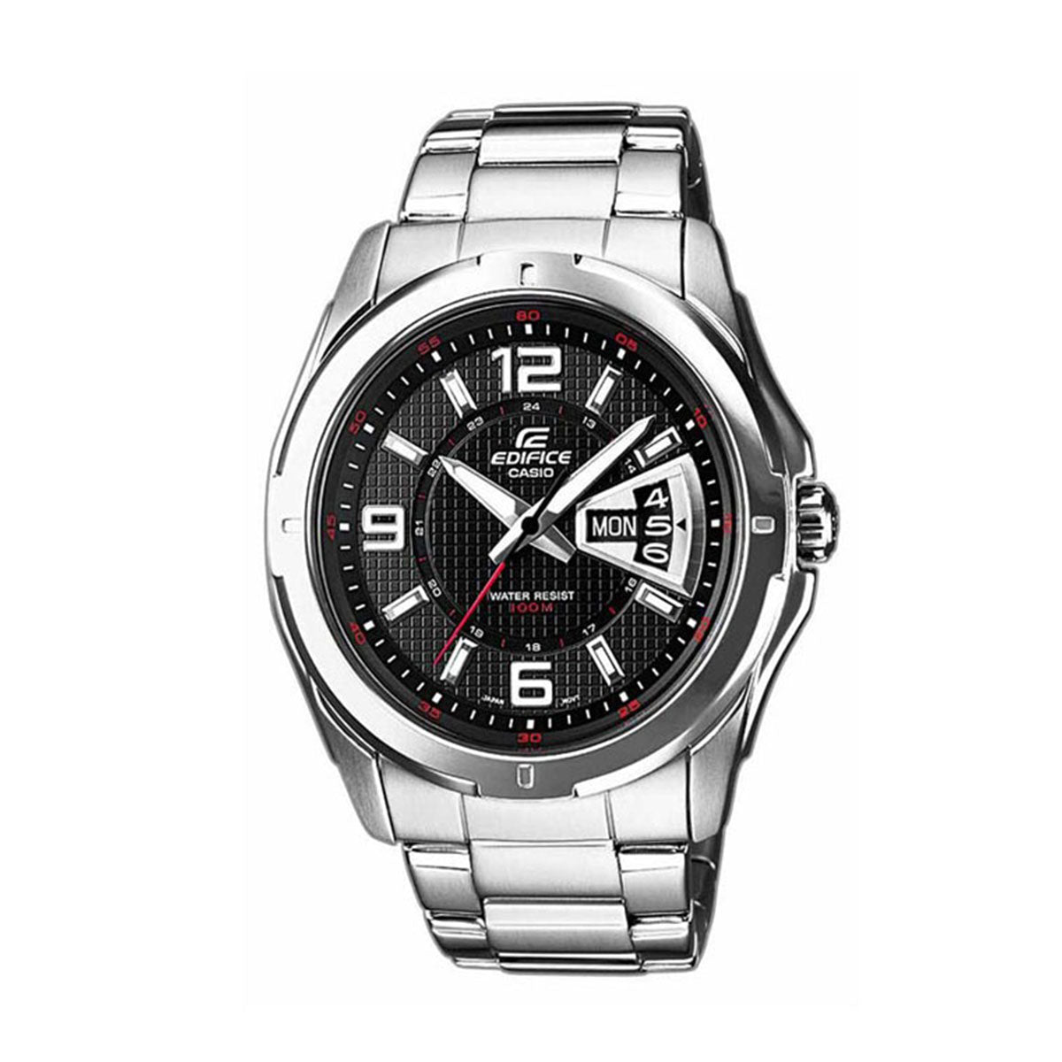 Εξοπλισμένο με μαύρο καντράν που διαθέτει λευκές και κόκκινες αποχρώσεις, έχει ασημί