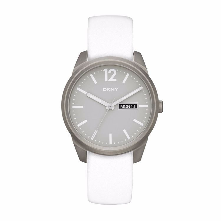Ένα πανέμορφο γυναικείο ρολόι του γνωστού οίκου DKNY με δερμάτινο λουράκι σε λευκή απόχρωση.