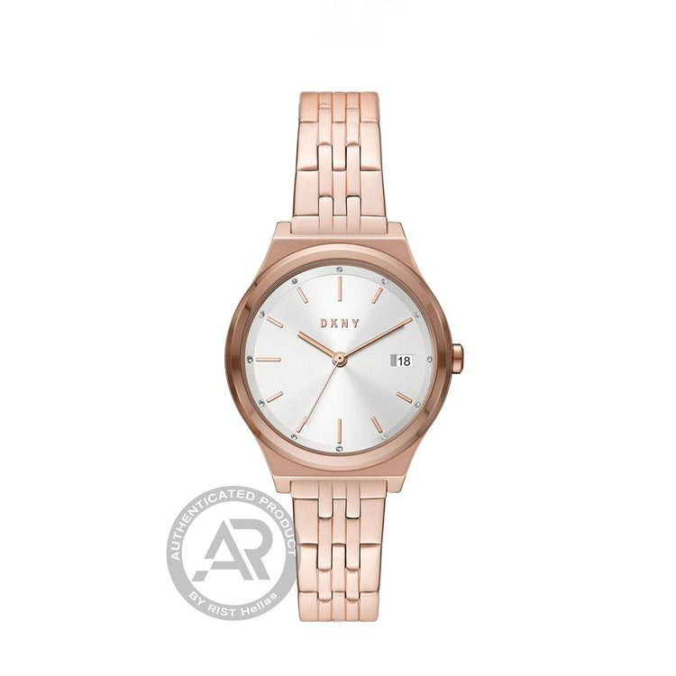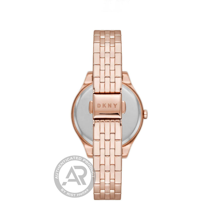 Ένα φανταστικό γυναικείο ρολόι του γνωστού οίκου DKNY με λεπτεπίλεπτο ατσάλινο μπρασελέ σε ροζ χρώμα.