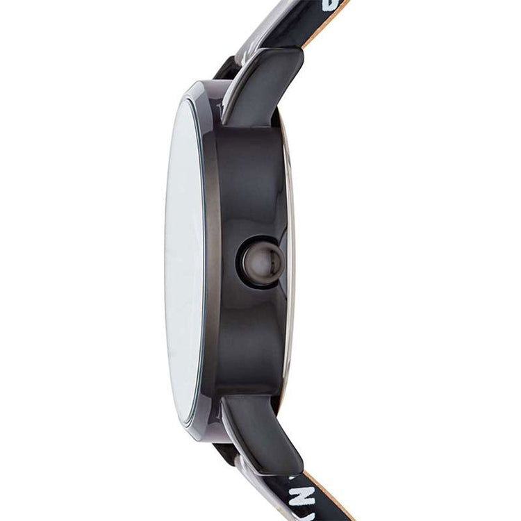 Ένα όμορφο και σε πιο casual στυλ γυναικείο ρολόι της εταιρίας DKNY με μαύρο δερμάτινο λουράκι με εμφανείς γραμματοσειρές λευκού χρώματος της επωνυμίας.