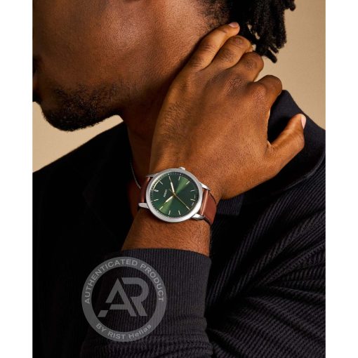 Αποτελείται από καφέ δερμάτινο λουράκι με ραφές και πράσινο καντράν. Η ασημί κάσα σε τέλειο σχεδιασμό αποτελεί δείγμα κομψότητας. Παράλληλα διαθέτει κίτρινους δείκτες με λευκό γέμισμα.