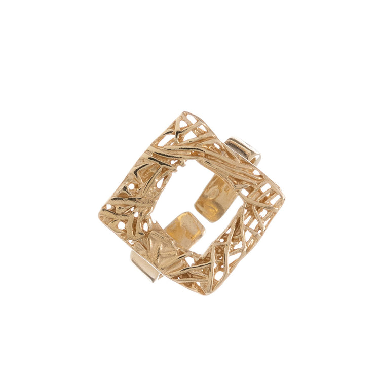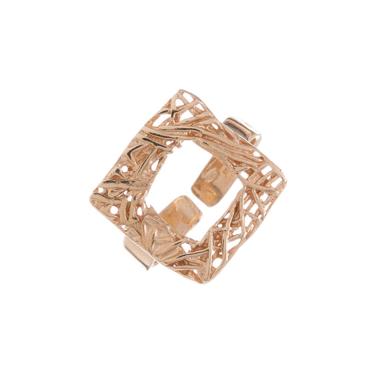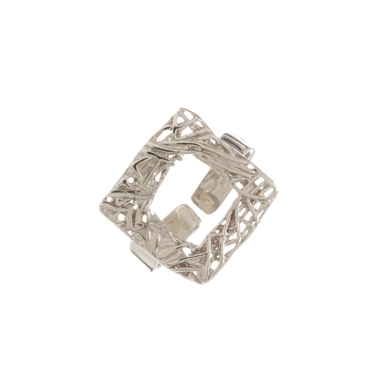 Ένα διάτρητο δαχτυλίδι τετράγωνο με μενταγιόν στην κορυφή του και ιδιαίτερο σχέδιο πλέγματος, από την Alisia, κατασκευασμένο από ασήμι 925.