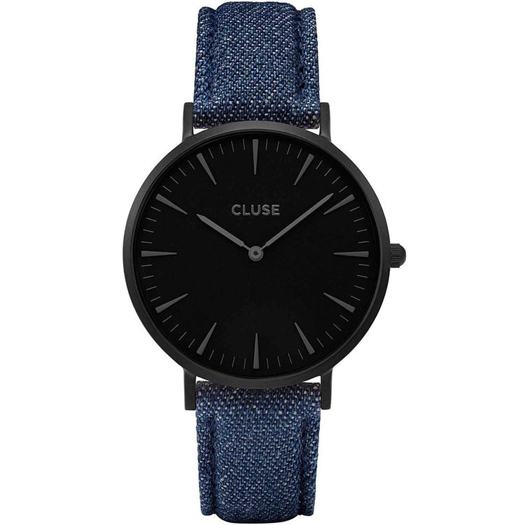 Ένα κομψό και με αρκετά μοντέρνο χαρακτήρα ρολόι unisex της εταιρίας CLUSE . Συνδυάζει αρμονικά το μαύρο του καντράν με το πρωτότυπο δερμάτινο λουράκι επενδυμένο με τζιν ύφασμα.